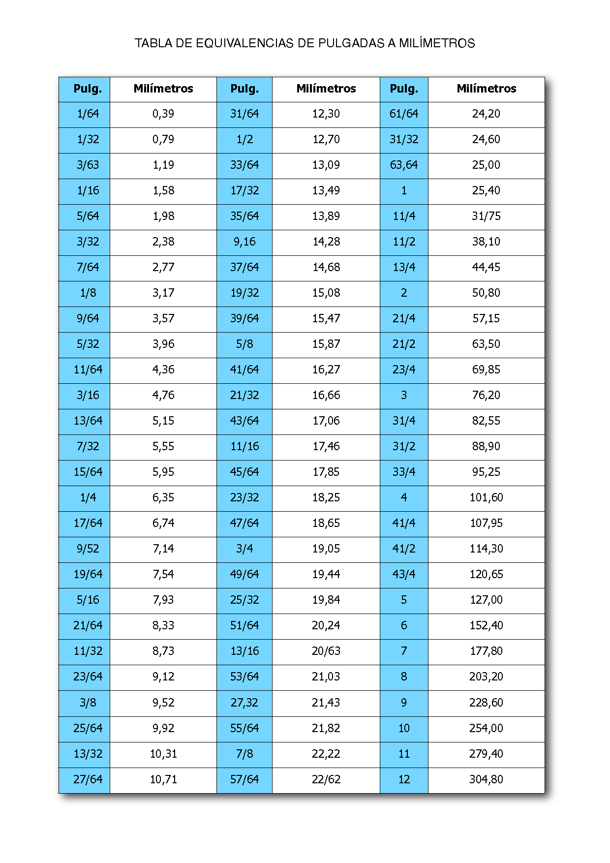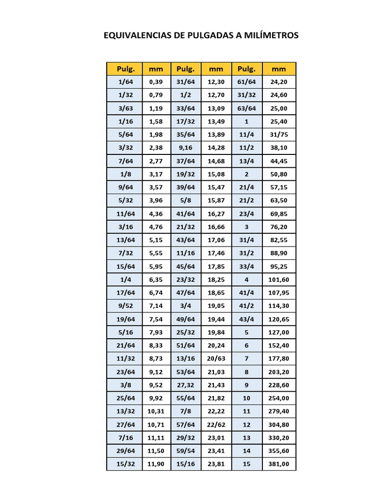 Tabla De Equivalencias De Milimetros A Pulgadas Pdf